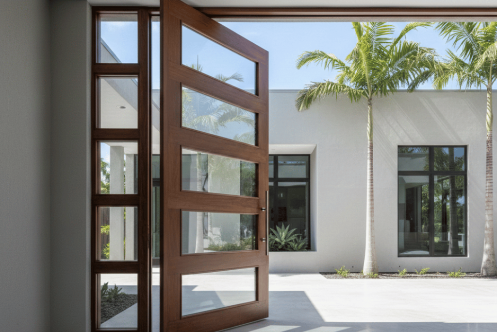 When engineered for hurricane resistance, pivot doors combine this movement with laminated impact glass, reinforced cores, and pressure-rated hardware.